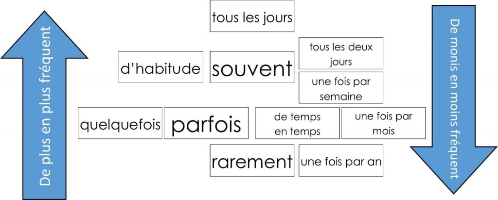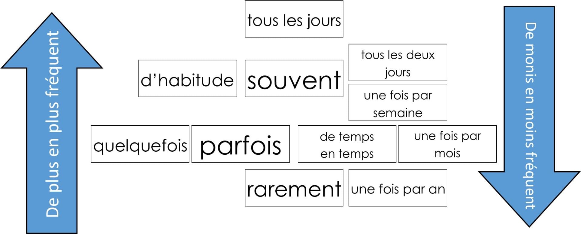 Les adverbes marquant le temps – SOLUTION January 22, 2019 jstubbs N’oublie pas que certaines expressions ne sont pas exactement identiques : “quelquefois” et “une fois par mois”, par exemple, ne sont pas pareils. Néanmoins, selon le contexte de ton paragraphe, ces expressions peuvent exprimer une idée similaire.