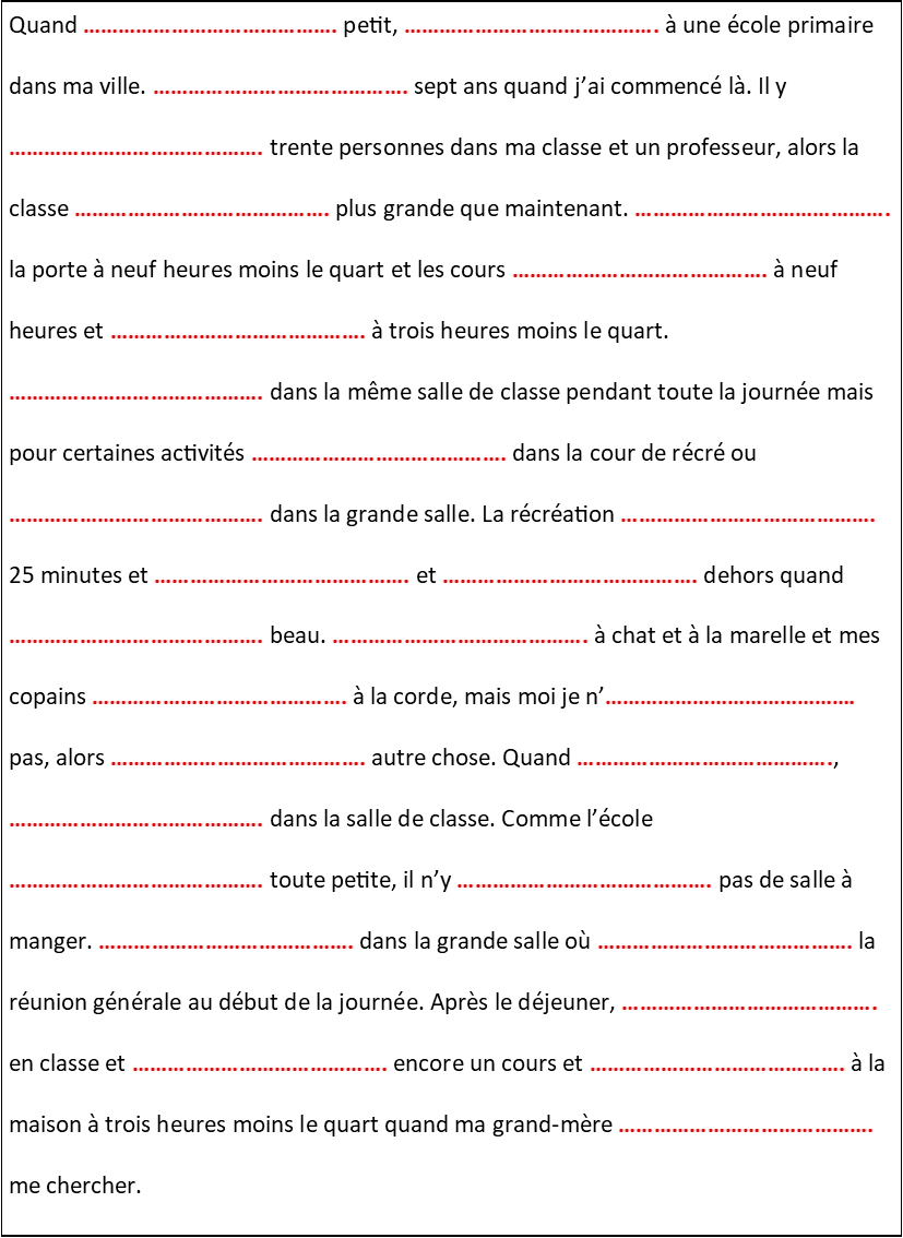 Instructions : Ecoute l’enregistrement et remplis les blancs des verbes au passé à l’imparfait. N’oublie pas d’écrire, le cas échéant, le pronom personnel sujet.
